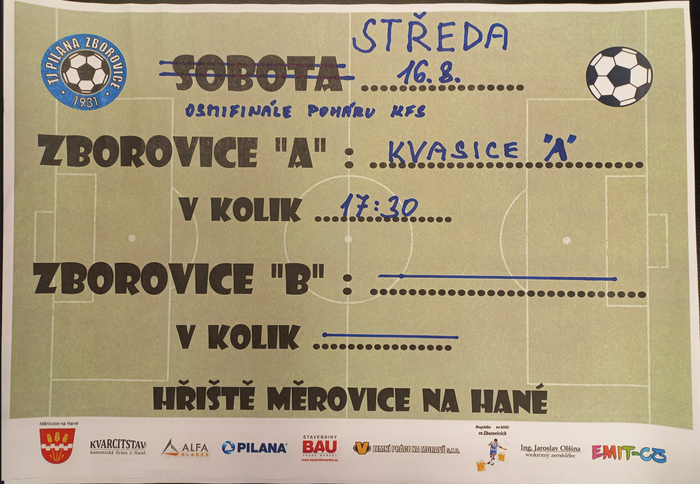 1) Ve středu 16.srpna 2023 v 17,30 hod. se na hřišti TJ Haná v Měrovicích nad Hanou uskuteční osmifinále poháru KFS mezi TJ Pilana Zborovice "A" a Kvasice "A"
