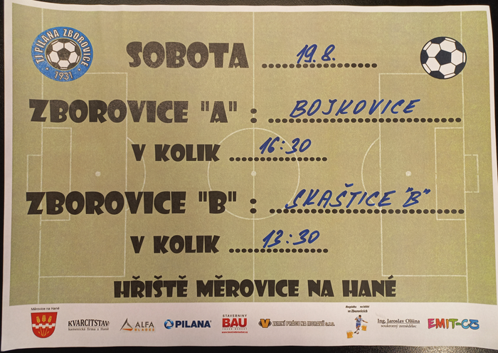 3) V sobotu 19.srpna 2023 v 16,30 hod. se na hřišti TJ Haná v Měrovicích nad Hanou uskuteční fotbalové utkání mezi TJ Pilana Zborovice "A" a Bojkovice
