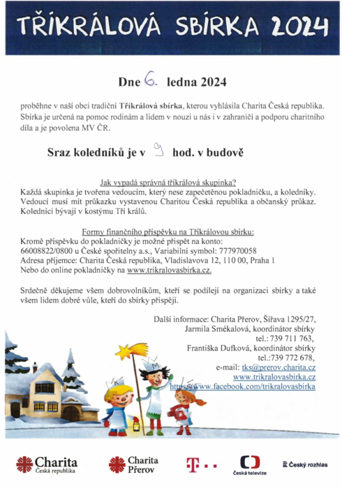 proběhne v naší obci tradiční Tříkrálová sbírka, kterou vyhlásila Charita Česká republika.