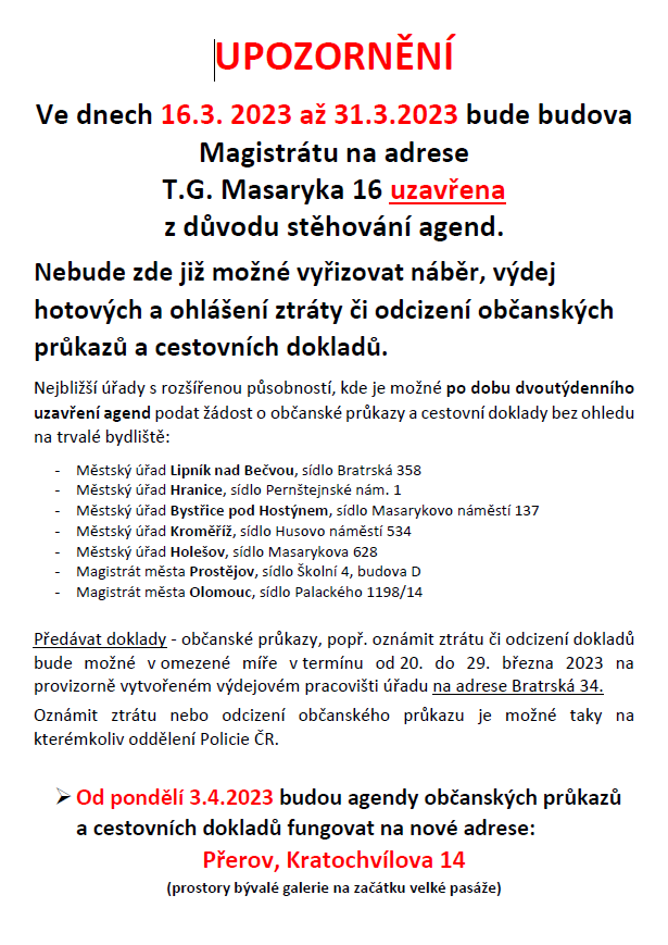 Uzavření pracoviště občanské a cestovní doklady